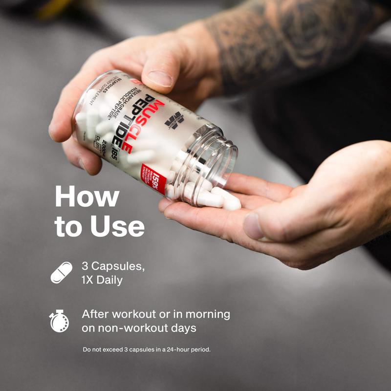 For best results, take the recommended serving of Muscle Peptide 185 Formula daily as part of your fitness routine. Consistency helps support ongoing muscle protein synthesis.